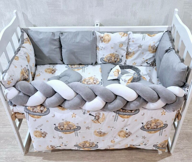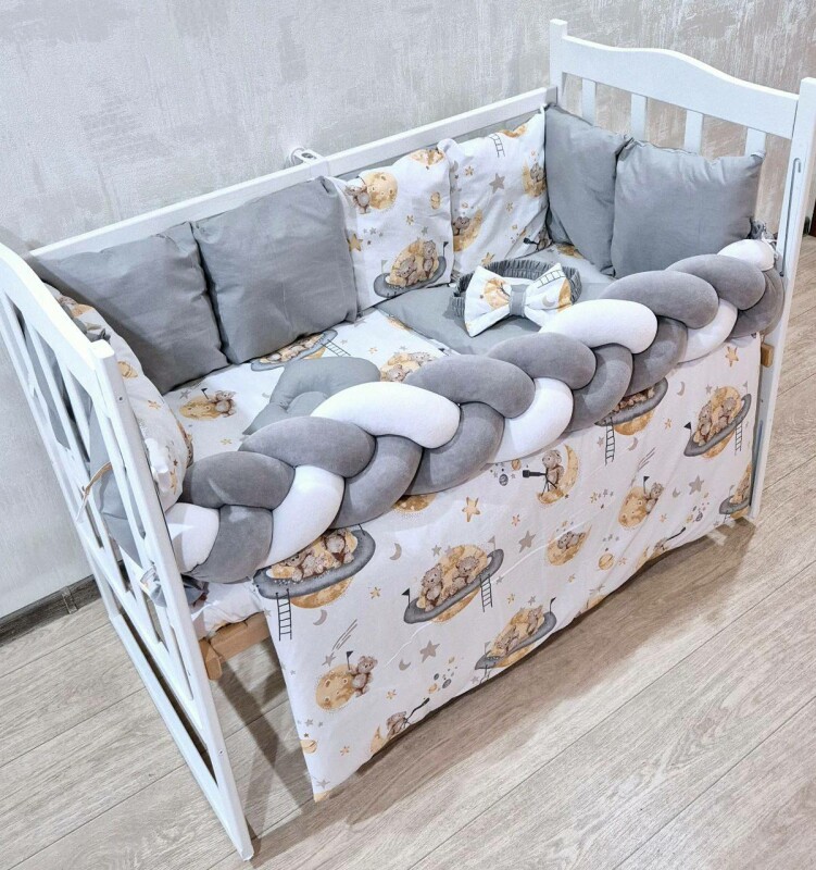 Комплект постільної білизни, в дитяче ліжечко. Сірі іграшки принт з хмаринкою