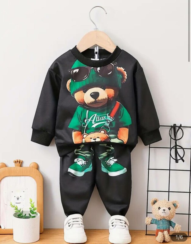 Стильний дитячий костюм «Cool Bear» — модний вибір для маленьких трендсетерів. Комплект складається з чорного світшота та штанів з яскравим принтом ведмедика у зеленому образі, сонцезахисних окулярах та кросівках. М’який і приємний на дотик матеріал забезпечує комфорт під час активних ігор, а вільний крій не обмежує рухів. Ідеально підходить для прогулянок, садочка чи сімейних виходів.