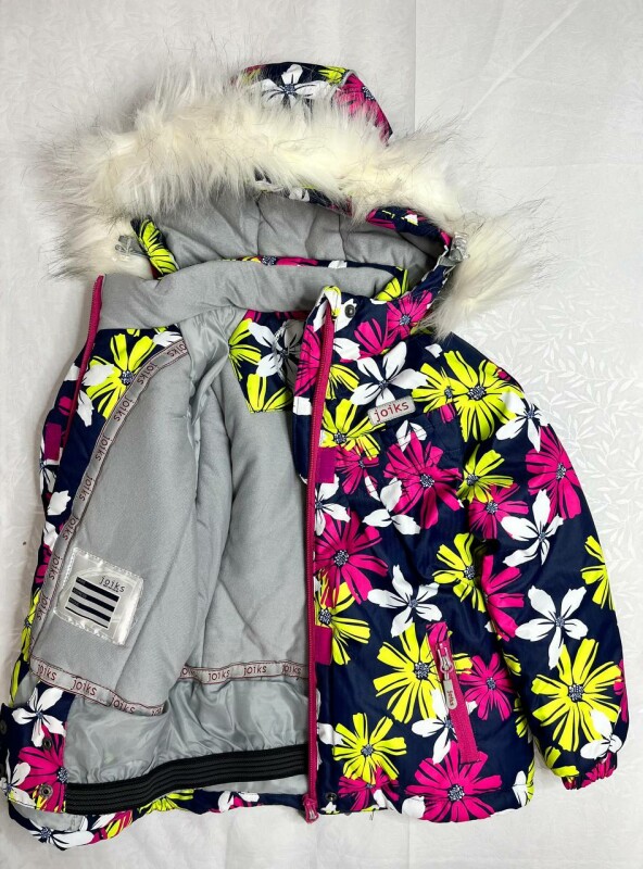 Теплий і зручний костюм для активних прогулянок узимку. Куртка з водовідштовхувальної тканини прикрашена яскравим квітковим принтом у поєднанні рожевого, жовтого та білого кольорів. Усередині — м’яка утеплена підкладка, що забезпечує комфорт і тепло навіть у морозну погоду. Капюшон із хутром додає затишку й захисту від вітру.