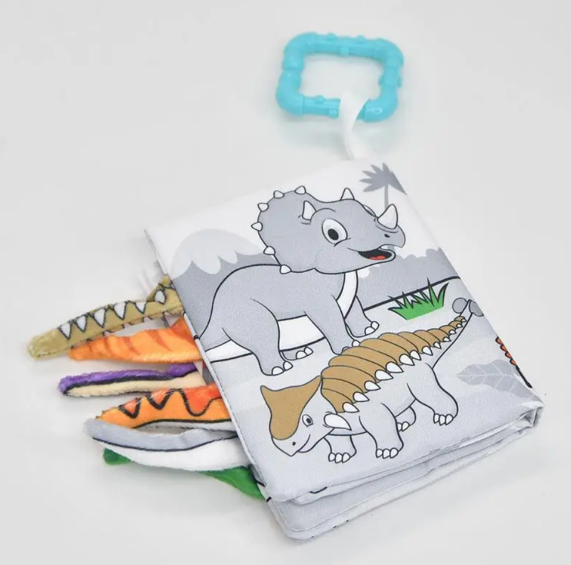 Дитяча книжечка з плюшевими хвостиками, що стирчать, - це розвиваюча іграшка, яка в ігровій формі познайомить малюка з різними видами динозаврів.