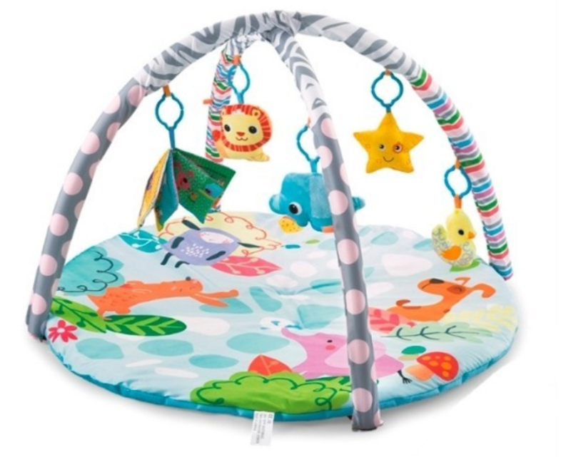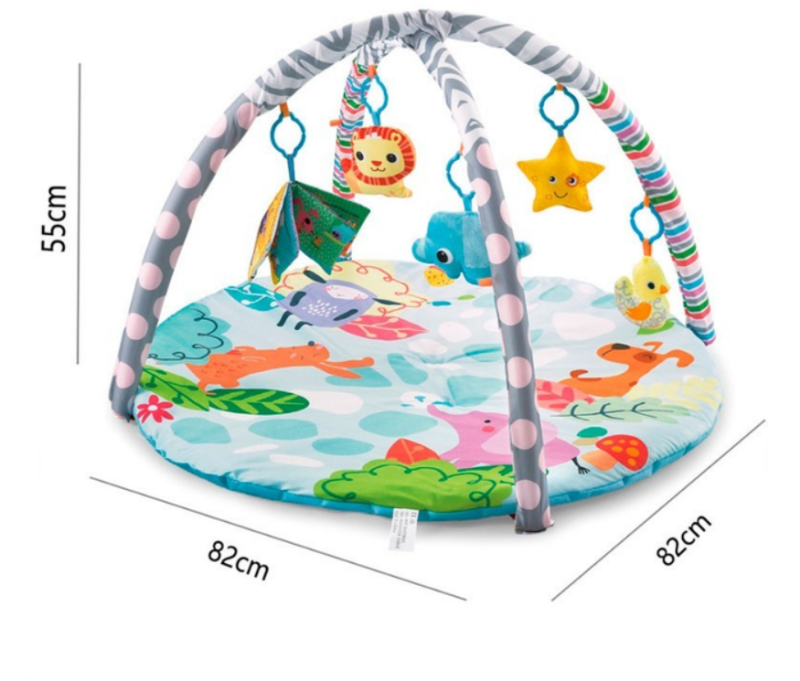 Килимок для малюків з м'якими брязкальцями на дузі підходить для дітей від 0 до 12 місяців, зроблений з м'якого матеріалу. Залежно від віку малюка він буде лежати, і спостерігатиме за іграшками, що висять зверху, або повзати по килимку, намагаючись дістати іграшки. Килимок для новонародженого постачається в комплекті з двома м'якими дугами та підвісними іграшками.