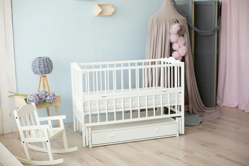 Ліжко для новонароджених "Ангеліна" від виробника Кузя з поперечним маятником та шухлядою в білому кольорі