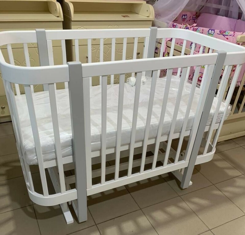 Дитяче ліжечко для новонароджених "Мія" виробник Кузя без шухляди з поперечним маятником в білому кольорі з сірими ніжками