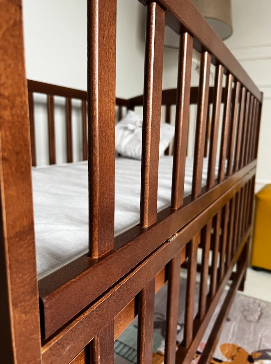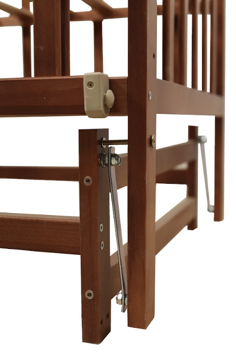 Велика увага приділена безпеці: планки розташовані на такій відстані одна від одної, щоб ручка або ніжка малюка не могли застрягти між ними. Боковина ліжка відкидна і фіксується міцними пластмасовими фіксаторами, забезпечуючи зручний доступ до дитини і одночасно гарантуючи її безпеку.