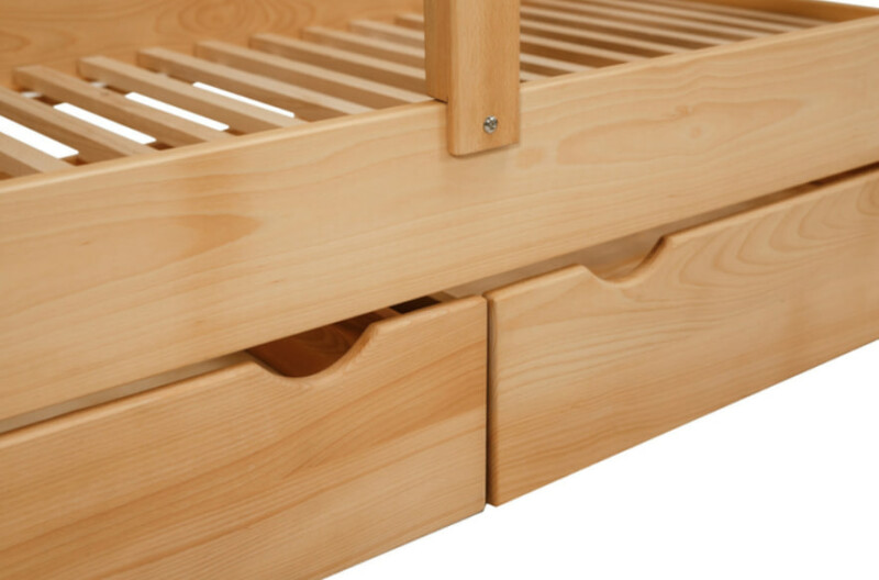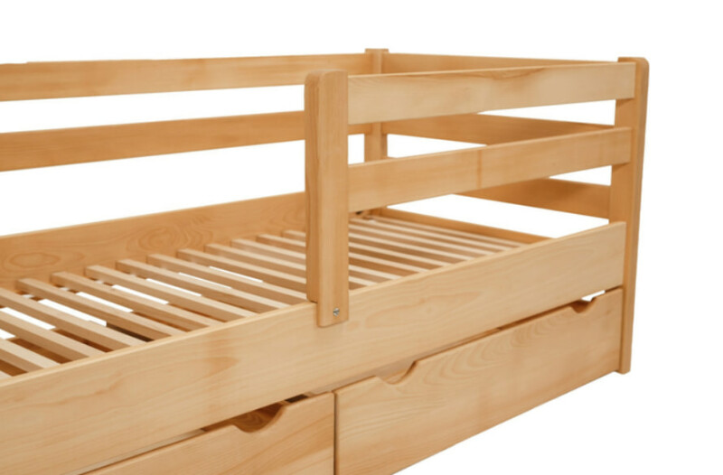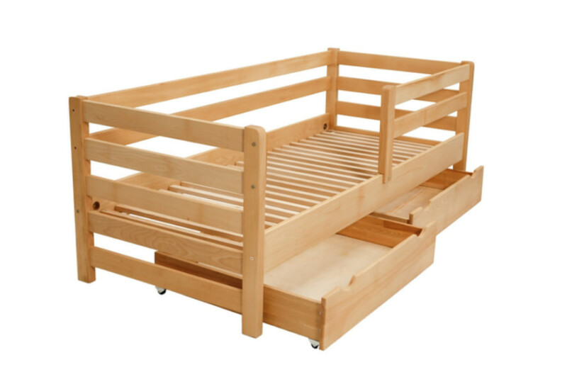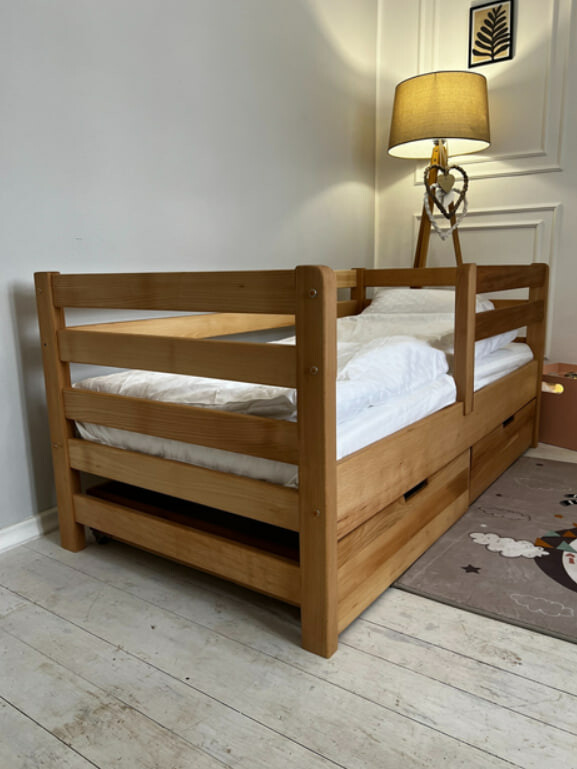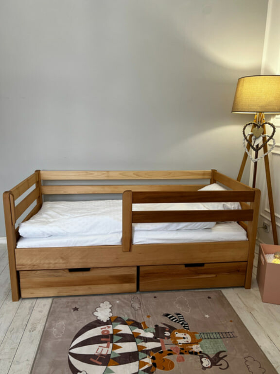 Модель ліжка виготовлена ​​з масиву дерева бук, яке ретельно відшліфовано та покрито екологічною лляною олією. Ліжко спроектоване за класичною схемою на меблевих гвинтах. Модель має захисний борт для безпеки дитини, який за бажанням згодом не можна не прикріплювати. Під ліжком передбачені два великі ящики на колесах для зберігання різних речей, які також виготовлені з дерева бук.