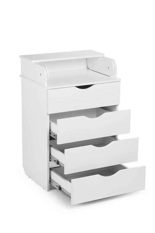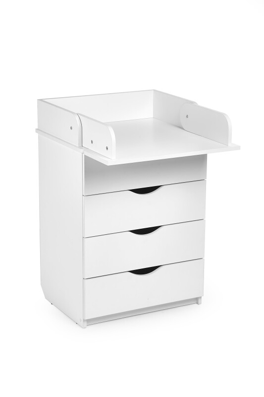 Дитячий KOMOD – ідеальне рішення цього питання. Він не займає багато простору та характеризується чудовою місткістю. У його чотирьох ящиках знайдеться місце для всього необхідного. Верхня частина комоду легко відкидається та перетворюється в зручний пеленальний столик, який за необхідності знімається. А заокруглені бортики дозволять безпечно переодягнути малюка.