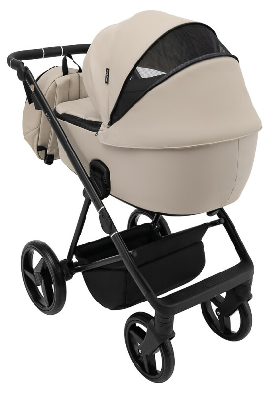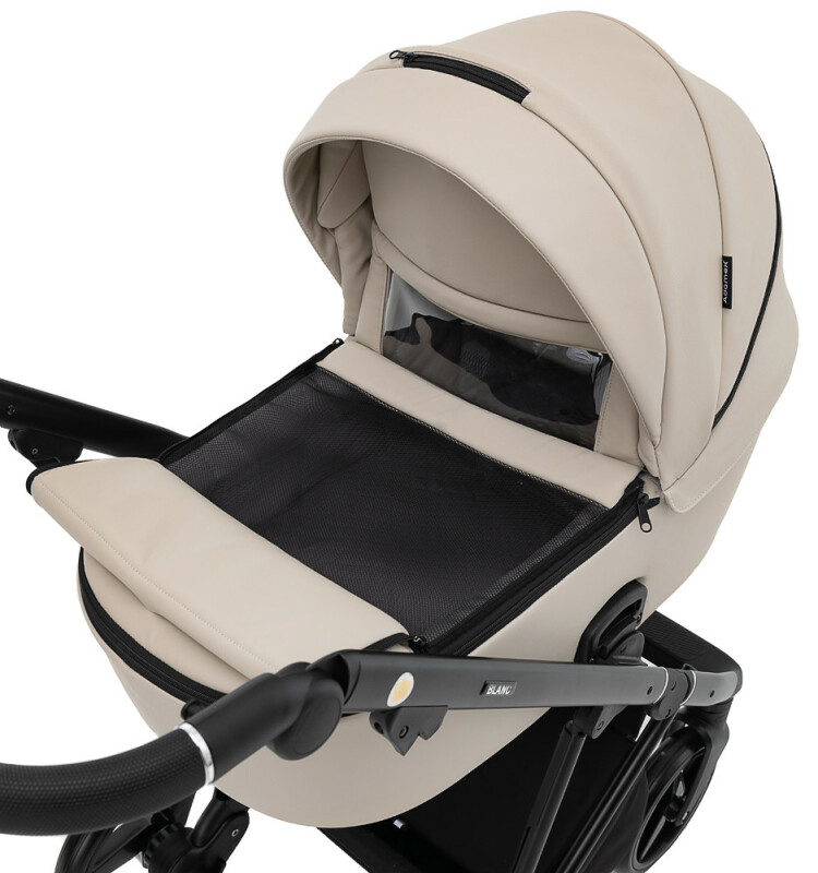 Люлька коляски Adamex Blanc пропонує просторе та комфортне спальне місце. Внутрішня бавовняна оббивка та матрац із кокосового волокна сприяють здоровому сну малюка. Накидка на ніжки добре закриває дитину від вітру, виконана із щільної тканини, кріпиться за допомогою блискавки. Капюшон оснащений кнопкою регулювання, великою секцією для провітрювання з москітною сіткою та додатковим козирком.