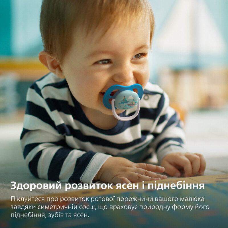 Завдяки великим вентиляційним отворам на тримачі шкіра дитини добре дихає, що зменшує ризик подразнень. Ортодонтична симетрична соска повторює природну форму піднебіння, зубів і ясен, сприяючи правильному формуванню прикусу.