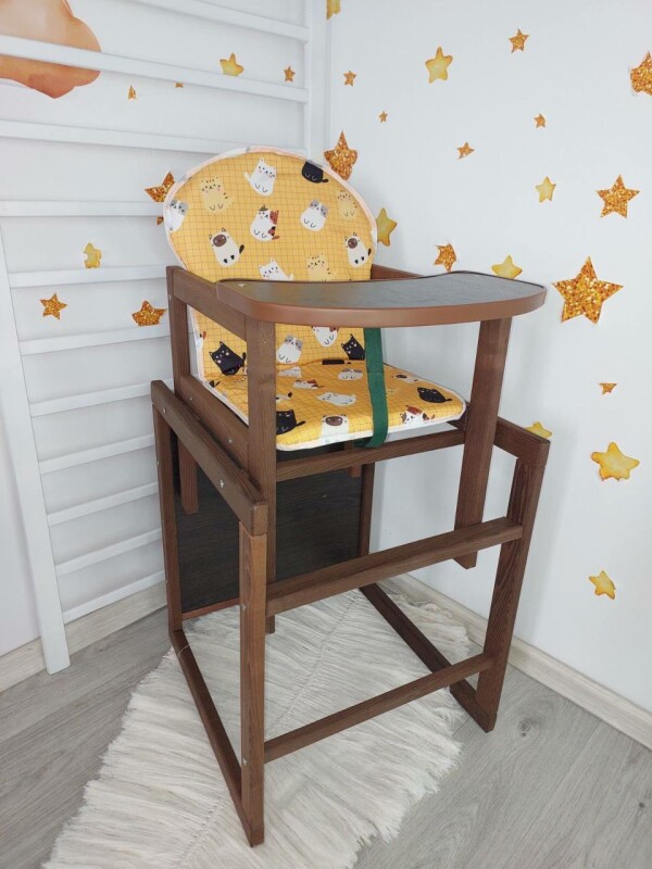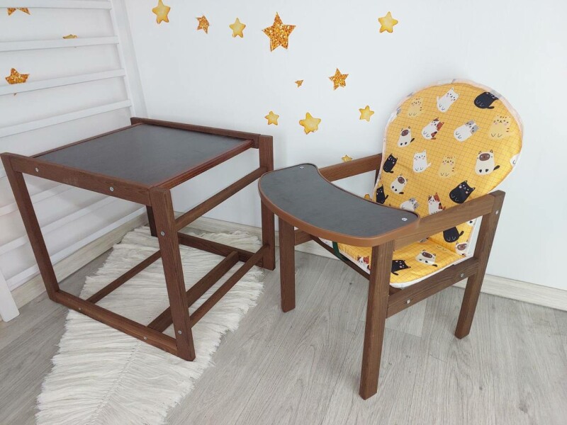 Дерев'яний стільчик для годування може трансформуватися власне з високого стільця для годування з індивідуальною стільницею в стіл парту для годування, ігор та занять.