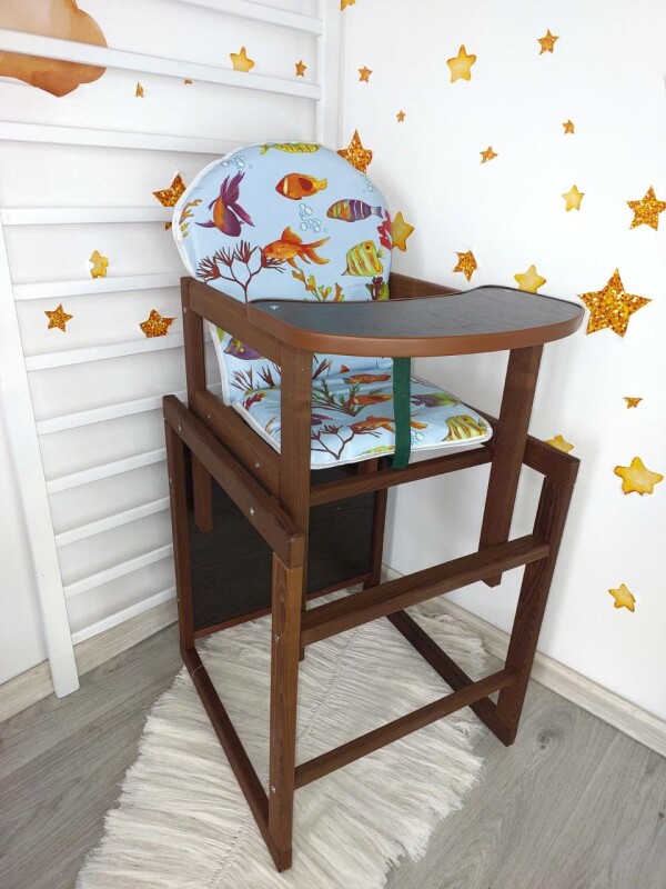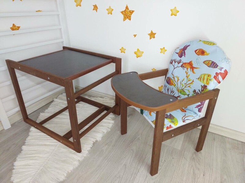 Дерев'яний стільчик для годування може трансформуватися власне з високого стільця для годування з індивідуальною стільницею в стіл парту для годування, ігор та занять.