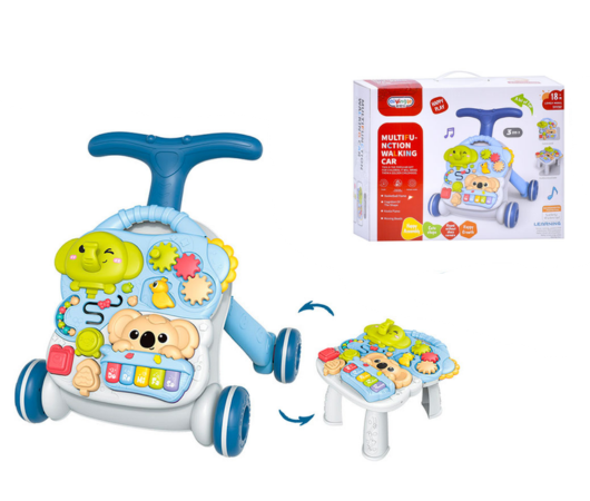 Модель легко трансформується: її можна використовувати як ігровий столик, інтерактивну панель або каталку-ходунки. Яскрава панель із милим дизайном (коала та звірятка) оснащена кнопками, шестернями та музичним піаніно, що стимулює розвиток моторики, слуху та координації.