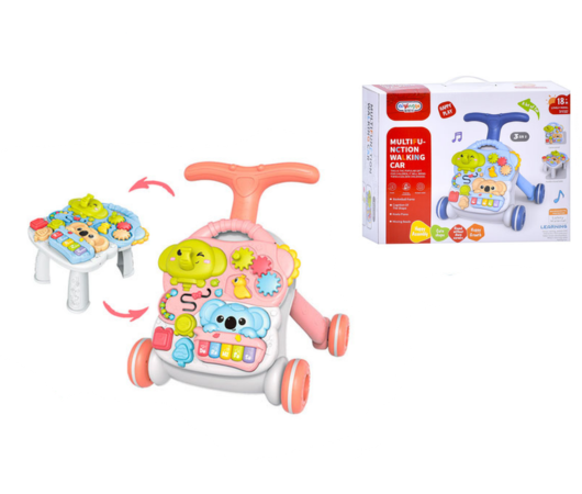 Модель легко трансформується: її можна використовувати як ігровий столик, інтерактивну панель або каталку-ходунки. Яскрава панель із милим дизайном (коала та звірятка) оснащена кнопками, шестернями та музичним піаніно, що стимулює розвиток моторики, слуху та координації.