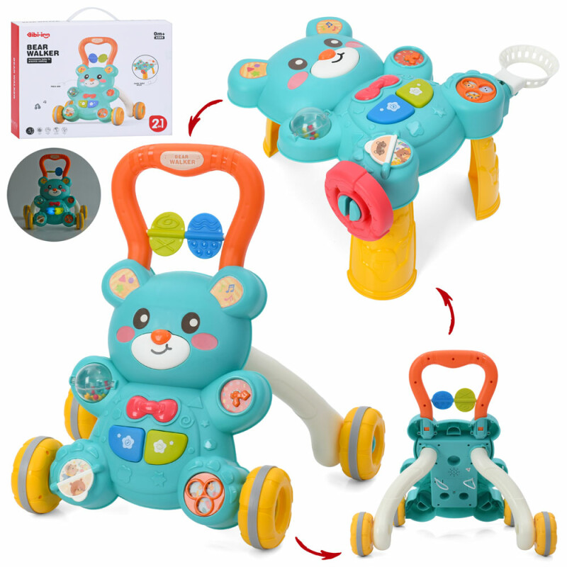 Каталка-ходунки 6084 — це яскрава розвиваюча іграшка 2в1 у вигляді милого ведмедика, яка допомагає малюку зробити перші кроки та розвиває його навички під час гри.