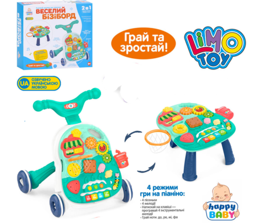 • 2в1: каталка-ходунки + ігровий столик (бізіборд)